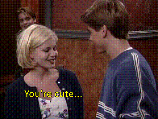 During the credits, Eric and Melissa Joan Hart are hanging out on the balcony and eventually go out for a bite to eat. It's "funny" because, as we all know, Melissa played Sabrina the Teenage Witch, which was in its 3rd season (read as: it wasn't garbage yet) on ABC when this episode aired. For anyone wondering, it was the 5th season of Sabrina where she went to higher and nobody cared anymore. Also, it'southward very obvious how much improve Melissa Joan Hart is at interim than Candace Cameron.